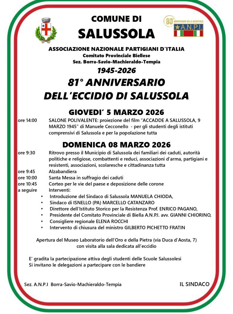 Nell’ambito delle celebrazioni, giovedì 5 marzo 2026, al Salone polivalente di Salussola, sarà proiettato per gli studenti degli istituti comprensivi di Salussola e per tutta la cittadinanza, alle ore 14, il docufilm di Manuele Cecconello Accadde a Salussola. 9 marzo 1945, realizzato nell’occasione dell’80° anniversario dell’eccidio di Salussola, nell’ambito del programma di eventi messo a punto da vari enti istituzionali e associazioni del territorio, tra cui l’Istorbive, capofila del progetto.