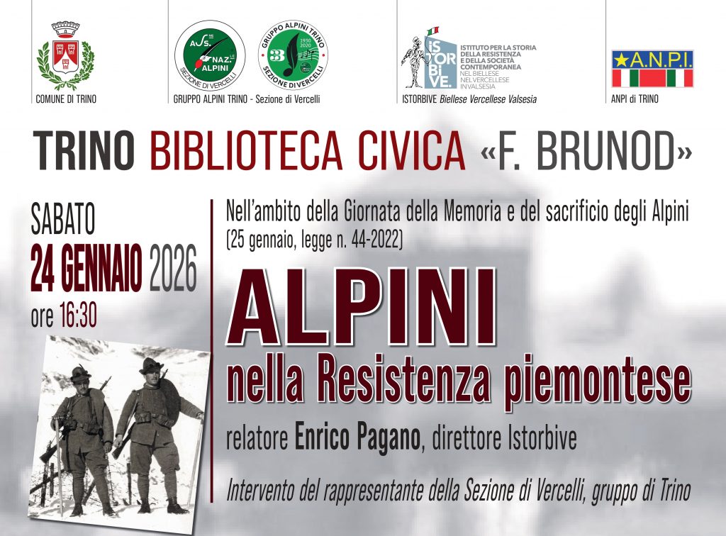 Sabato 24 gennaio 2026, alla Biblioteca civica “Favorino Brunod” di Trino, alle ore 16.30, nell’occasione della Giornata della memoria e del sacrificio degli Alpini, si terrà la conferenza Alpini nella Resistenza piemontese, con Enrico Pagano, direttore dell’Istorbive. Interverrà inoltre il rappresentante dell’Associazione nazionale Alpini, Sezione di Vercelli, Gruppo di Trino.