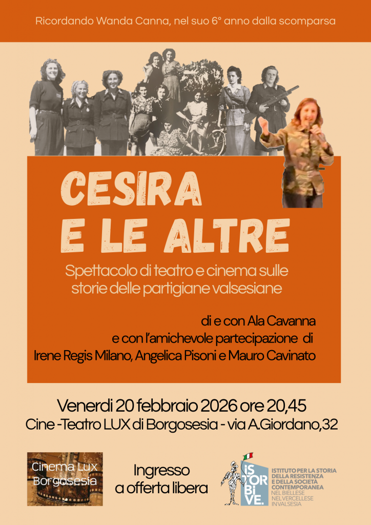 Venerdì 20 febbraio 2026, al Cine-teatro Lux di Borgosesia, alle ore 20.45, si terrà lo spettacolo di teatro e cinema sulle storie delle partigiane valsesiane Cesira e le altre, dell’attrice e regista piemontese Alessandra Cavanna, con Irene Regis Milano, Angelica Pisoni, Mauro Cavinato e la stessa Alessandra Cavanna.