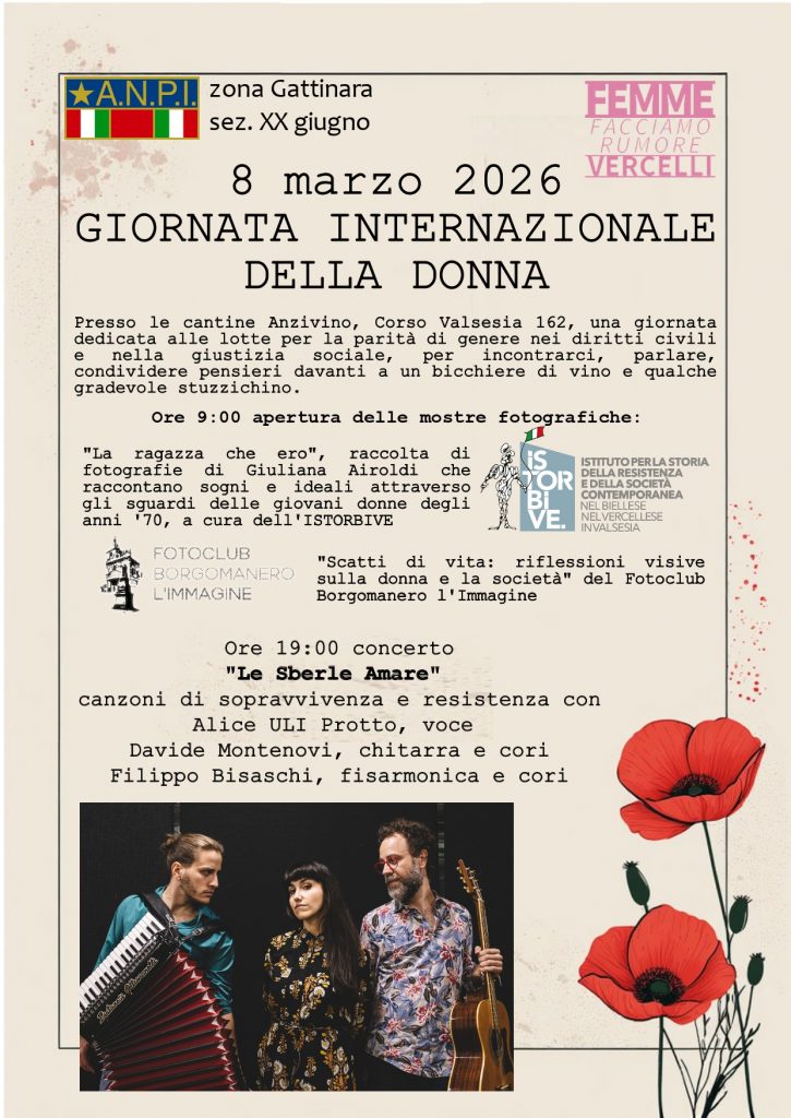 Domenica 8 marzo 2026, l’Anpi zona Gattinara sezione XX giugno e il coordinamento Femme Vercelli-Facciamo rumore organizzano a Gattinara, alle cantine Anzivino (corso Valsesia 162), una giornata dedicata alle lotte per la parità di genere nell’occasione della Giornata internazionale della donna.