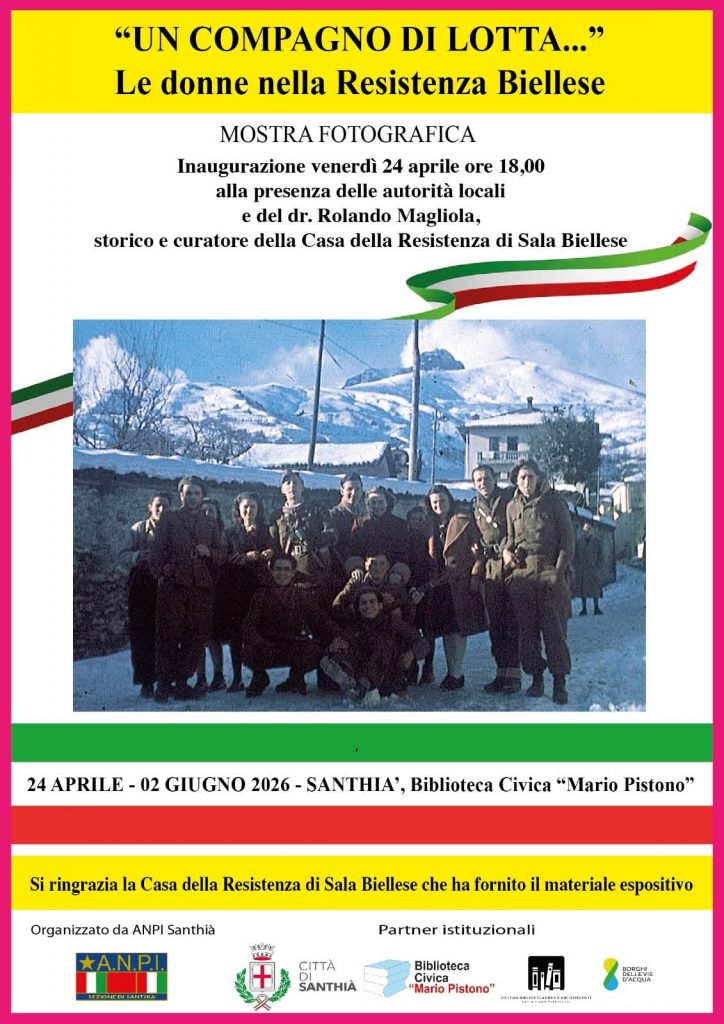 La mostra “Un compagno di lotta…”. Le donne nella Resistenza biellese, realizzata nel 2025 dalla Casa della Resistenza di Sala Biellese in occasione dell’80° anniversario della Liberazione, con il patrocinio del Comune di Sala Biellese e dell’Istorbive, sarà esposta, su iniziativa dell’Anpi di Santhià, alla Biblioteca civica “Mario Pistono” di Santhià, dal 25 aprile al 2 giugno 2026.