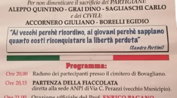 Il ritrovo è alle ore 10 al monumento partigiano di Noveis, dove, dopo i saluti del sindaco di Caprile Stefano Ferrian e del segretario del Comitato Anpi Valsessera Stefano Marabelli, sarà tenuta l’orazione ufficiale da Elisabetta Dellavalle, consigliera dell’Istorbive e membro del direttivo dell’Anpi città di Vercelli, sezione “Anna Marengo”.