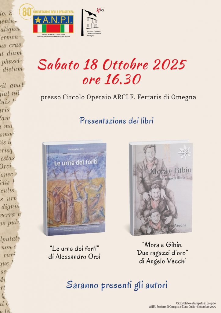 L’iniziativa, che prevede nell’occasione anche la presentazione del volume Mora e Gibin due ragazzi d’oro di Angelo Vecchi, è organizzata dall’Anpi sezione Omegna e Zona Cusio-Comitato provinciale Verbano Cusio Ossola.