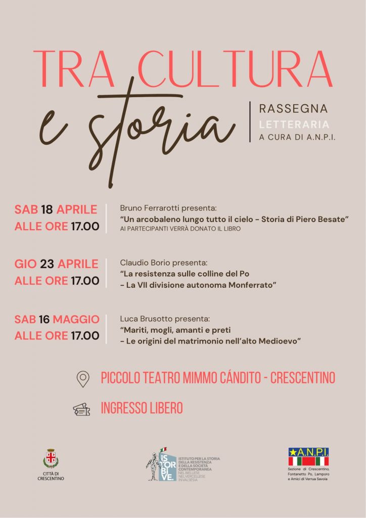 L’iniziativa, cui l’Istorbive ha fornito il suo patrocinio, si inserisce nell’ambito di Tra cultura e storia, rassegna letteraria a cura dell’Anpi sezione di Crescentino, Fontanetto Po, Lamporo e Amici di Verrua Savoia, organizzata con il patrocinio della Città di Crescentino.