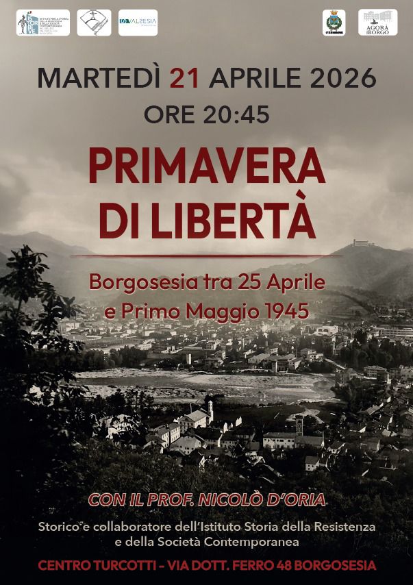 Martedì 21 aprile 2026, a Borgosesia, al Centro studi e documentazione Giovanni Turcotti (via dott. Ferro, 48), alle ore 20.45, si terrà, nell’occasione dell’anniversario della Liberazione, la conferenza Primavera di libertà. Borgosesia tra 25 aprile e Primo maggio 1945, a cura di Nicolò D’Oria, storico e collaboratore dell’Istorbive.