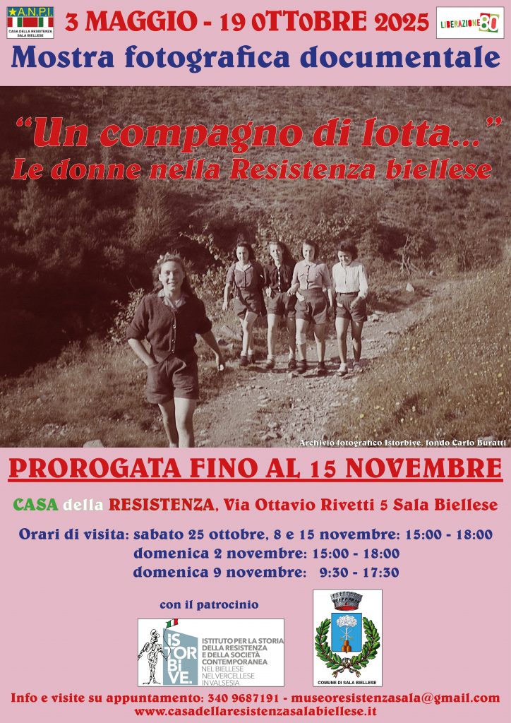 Segnaliamo che la mostra fotografica e documentale “Un compagno di lotta…”. Le donne nella Resistenza biellese, incentrata sui profili biografici delle oltre trecento donne che in qualità di partigiane, staffette e collaboratrici militarono nelle file delle formazioni resistenziali biellesi, realizzata nell’occasione dell’80° anniversario della Liberazione dalla Casa della Resistenza di Sala Biellese – con il patrocinio del Comune di Sala Biellese e dell’Istorbive – è stata prorogata fino al 15 novembre.