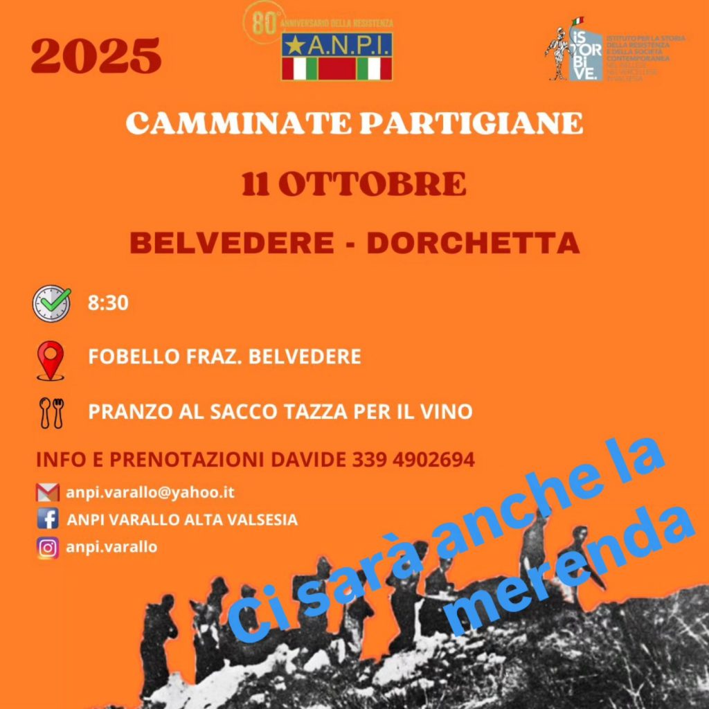 Sabato 11 ottobre 2025 si terrà l’ultima camminata partigiana per il 2025 da Belvedere di Fobello al Colle della Dorchetta, organizzata dall’Anpi Varallo e Alta Valsesia, in collaborazione con l’Istorbive e le altre sezioni valsesiane dell’Anpi.