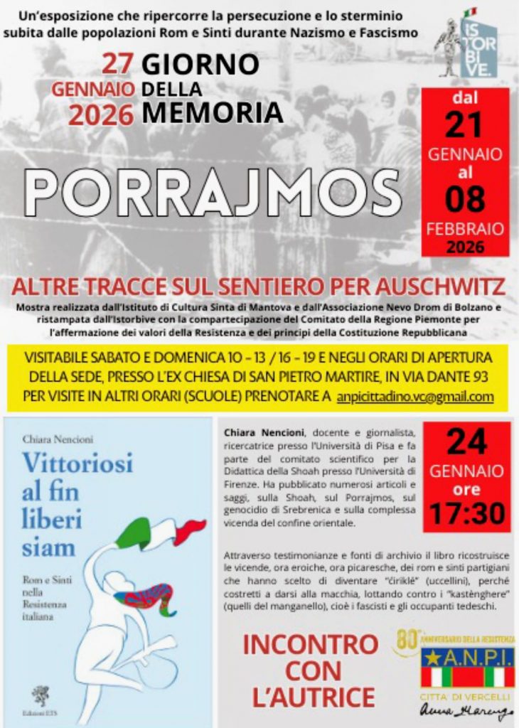 Dal 21 gennaio all’8 febbraio 2026, sarà esposta a Vercelli, nella sede dell’Anpi della città (ex chiesa di San Pietro Martire, via Dante, 93), la mostra Porrajmos. Altre tracce sul sentiero per Auschwitz, che ripercorre le vicende della persecuzione e dello sterminio subiti dalle popolazioni rom e sinte ad opera dei regimi nazista e fascista.