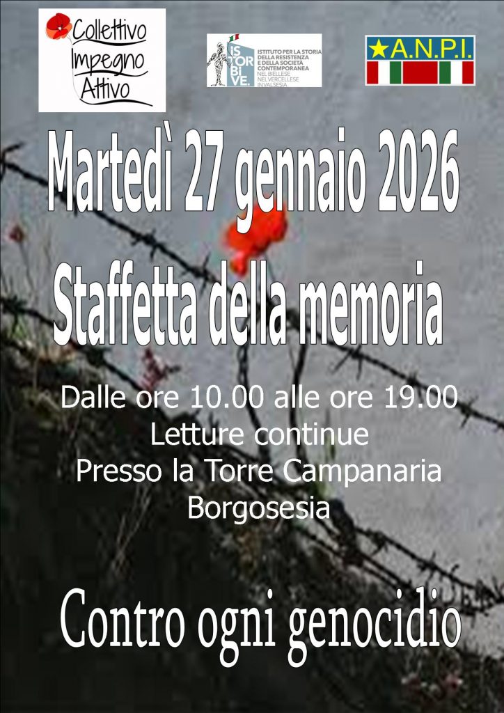 Martedì 27 gennaio 2026, a Borgosesia (presso la Torre campanaria), dalle 10 alle 19, si svolgerà la Staffetta della Memoria. Circa settanta persone si alterneranno senza interruzione nella lettura dei nomi dei deportati vercellesi, biellesi e valsesiani nei Lager nazisti e di testimonianze e brani sui temi della Shoah e della deportazione.